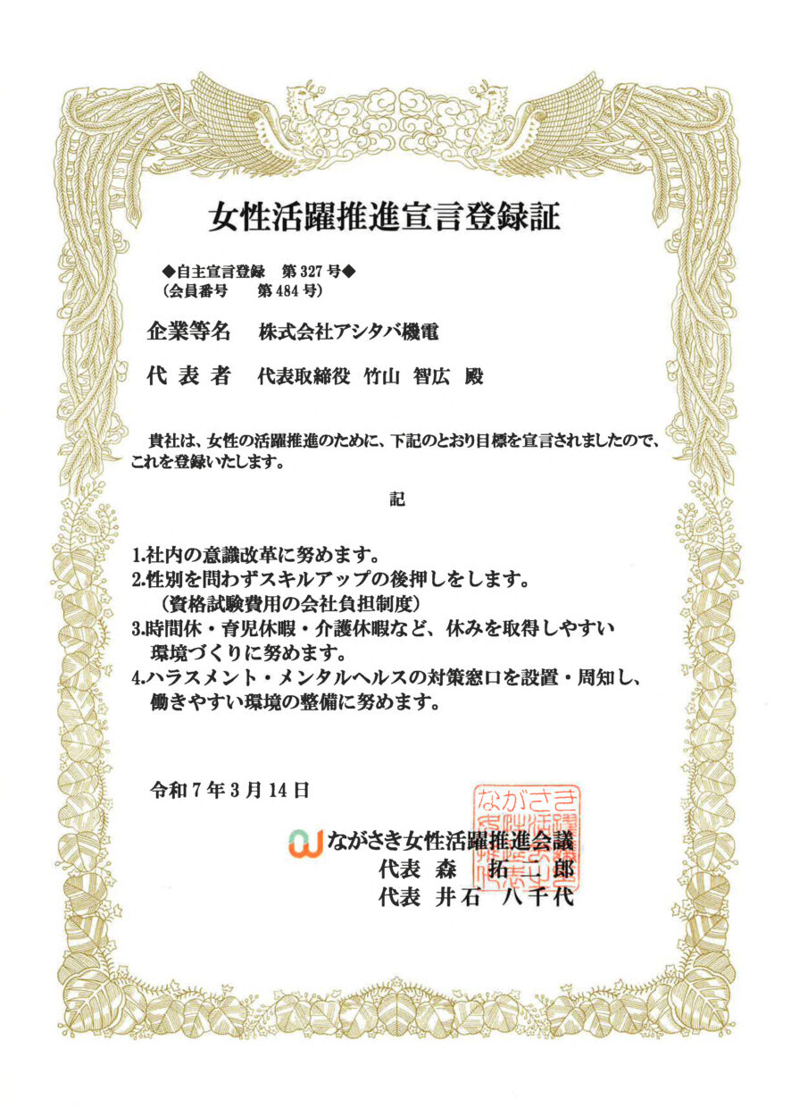アシタバ機電では性別に関わりなく、働きやすい職場づくりや優秀な人材を登用するなど女性が活躍できる環境を作ることを目指し、「ながさき女性活躍推進会議自主宣言会員 」の企業登録を行いました。